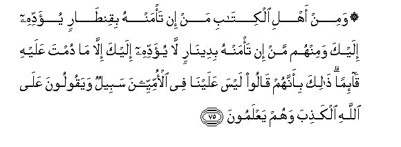 75. Wamin ahli alkitabi man in ta/manhu biqintarin yu-addihi ilayka waminhum man in ta/manhu bideenarin la yu-addihi ilayka illa ma dumta AAalayhi qa-iman thalika bi-annahum qaloo laysa AAalayna fee al-ommiyyeena sabeelun wayaqooloona AAala Allahi alkathiba wahum yaAAlamoona