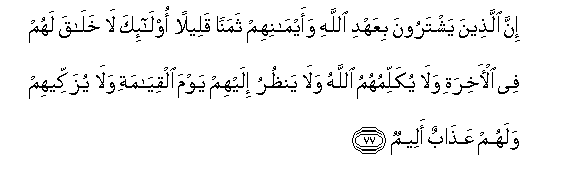 77. Inna allatheena yashtaroona biAAahdi Allahi waaymanihim thamanan qaleelan ola-ika la khalaqa lahum fee al-akhirati wala yukallimuhumu Allahu wala yanthuru ilayhim yawma alqiyamati wala yuzakkeehim walahum AAathabun aleemun
