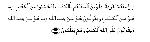 78. Wa-inna minhum lafareeqan yalwoona alsinatahum bialkitabi litahsaboohu mina alkitabi wama huwa mina alkitabi wayaqooloona huwa min AAindi Allahi wama huwa min AAindi Allahi wayaqooloona AAala Allahi alkathiba wahum yaAAlamoona