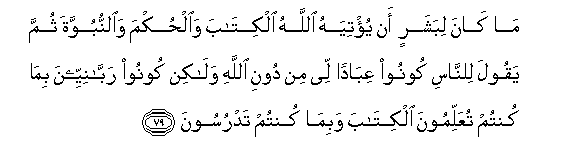 79. Ma kana libasharin an yu/tiyahu Allahu alkitaba waalhukma waalnnubuwwata thumma yaqoola lilnnasi koonoo AAibadan lee min dooni Allahi walakin koonoo rabbaniyyeena bima kuntum tuAAallimoona alkitaba wabima kuntum tadrusoona