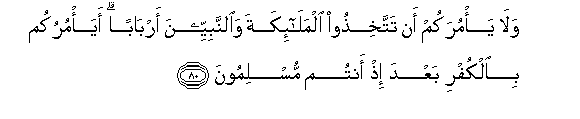 80. Wala ya/murakum an tattakhithoo almala-ikata waalnnabiyyeena arbaban aya/murukum bialkufri baAAda ith antum muslimoona