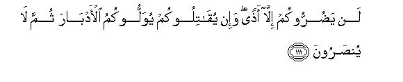 111. Lan yadurrookum illa athan wa-in yuqatilookum yuwallookumu al-adbara thumma la yunsaroona