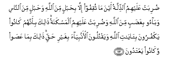 112. Duribat AAalayhimu alththillatu ayna ma thuqifoo illa bihablin mina Allahi wahablin mina alnnasi wabaoo bighadabin mina Allahi waduribat AAalayhimu almaskanatu thalika bi-annahum kanoo yakfuroona bi-ayati Allahi wayaqtuloona al-anbiyaa bighayri haqqin thalika bima AAasaw wakanoo yaAAtadoona