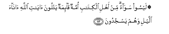 113. Laysoo sawaan min ahli alkitabi ommatun qa-imatun yatloona ayati Allahi anaa allayli wahum yasjudoona