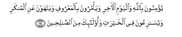 114. Yu/minoona biAllahi waalyawmi al-akhiri waya/muroona bialmaAAroofi wayanhawna AAani almunkari wayusariAAoona fee alkhayrati waola-ika mina alssaliheena