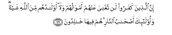 116. Inna allatheena kafaroo lan tughniya AAanhum amwaluhum wala awladuhum mina Allahi shay-an waola-ika as-habu alnnari hum feeha khalidoona