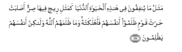 117. Mathalu ma yunfiqoona fee hathihi alhayati alddunya kamathali reehin feeha sirrun asabat hartha qawmin thalamoo anfusahum faahlakat-hu wama thalamahumu Allahu walakin anfusahum yathlimoona