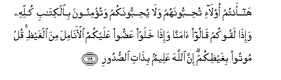 119. Ha antum ola-i tuhibboonahum wala yuhibboonakum watu/minoona bialkitabi kullihi wa-itha laqookum qaloo amanna wa-itha khalaw AAaddoo AAalaykumu al-anamila mina alghaythi qul mootoo bighaythikum inna Allaha AAaleemun bithati alssudoori