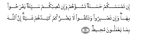 120. In tamsaskum hasanatun tasu/hum wa-in tusibkum sayyi-atun yafrahoo biha wa-in tasbiroo watattaqoo la yadurrukum kayduhum shay-an inna Allaha bima yaAAmaloona muheetun