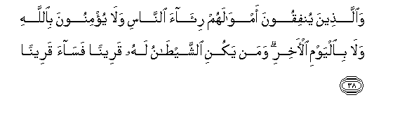 38. Waallatheena yunfiqoona amwalahum ri-aa alnnasi wala yu/minoona biAllahi wala bialyawmi al-akhiri waman yakuni alshshaytanu lahu qareenan fasaa qareenan