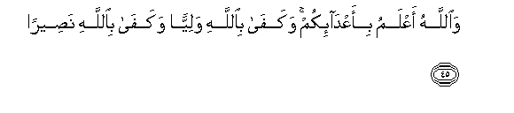 45. WaAllahu aAAlamu bi-aAAda-ikum wakafa biAllahi waliyyan wakafa biAllahi naseeran