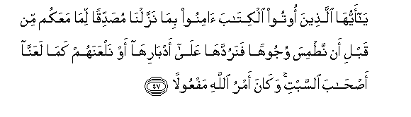 47. Ya ayyuha allatheena ootoo alkitaba aminoo bima nazzalna musaddiqan lima maAAakum min qabli an natmisa wujoohan fanaruddaha AAala adbariha aw nalAAanahum kama laAAanna as-haba alssabti wakana amru Allahi mafAAoolan