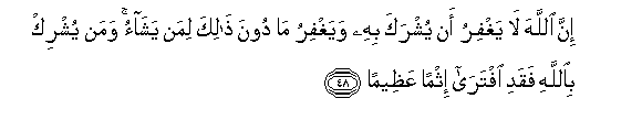 48. Inna Allaha la yaghfiru an yushraka bihi wayaghfiru ma doona thalika liman yashao waman yushrik biAllahi faqadi iftara ithman AAatheeman