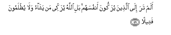 49. Alam tara ila allatheena yuzakkoona anfusahum bali Allahu yuzakkee man yashao wala yuthlamoona fateelan