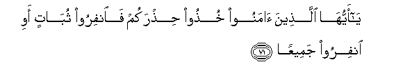 71. Ya ayyuha allatheena amanoo khuthoo hithrakum fainfiroo thubatin awi infiroo jameeAAan