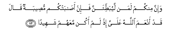 72. Wa-inna minkum laman layubatti-anna fa-in asabatkum museebatun qala qad anAAama Allahu AAalayya ith lam akun maAAahum shaheedan