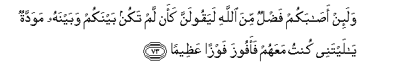 73. Wala-in asabakum fadlun mina Allahi layaqoolanna kaan lam takun baynakum wabaynahu mawaddatun ya laytanee kuntu maAAahum faafooza fawzan AAatheeman