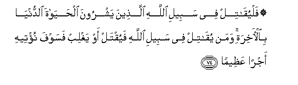 74. Falyuqatil fee sabeeli Allahi allatheena yashroona alhayata alddunya bial-akhirati waman yuqatil fee sabeeli Allahi fayuqtal aw yaghlib fasawfa nu/teehi ajran AAatheeman