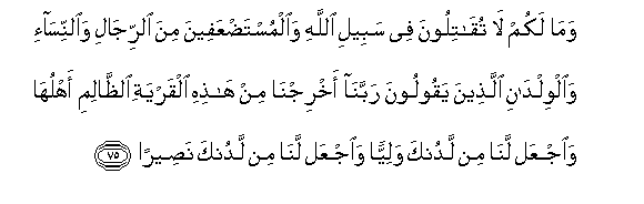 75. Wama lakum la tuqatiloona fee sabeeli Allahi waalmustadAAafeena mina alrrijali waalnnisa-i waalwildani allatheena yaqooloona rabbana akhrijna min hathihi alqaryati alththalimi ahluha waijAAal lana min ladunka waliyyan waijAAal lana min ladunka naseeran