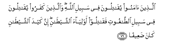 76. Allatheena amanoo yuqatiloona fee sabeeli Allahi waallatheena kafaroo yuqatiloona fee sabeeli alttaghooti faqatiloo awliyaa alshshaytani inna kayda alshshaytani kana daAAeefan