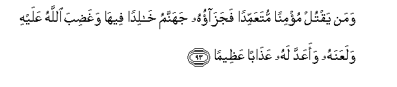 93. Waman yaqtul mu/minan mutaAAammidan fajazaohu jahannamu khalidan feeha waghadiba Allahu AAalayhi walaAAanahu waaAAadda lahu AAathaban AAatheeman