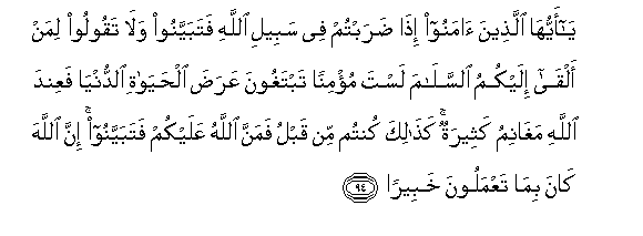 94. Ya ayyuha allatheena amanoo itha darabtum fee sabeeli Allahi fatabayyanoo wala taqooloo liman alqa ilaykumu alssalama lasta mu/minan tabtaghoona AAarada alhayati alddunya faAAinda Allahi maghanimu katheeratun kathalika kuntum min qablu famanna Allahu AAalaykum fatabayyanoo inna Allaha kana bima taAAmaloona khabeeran