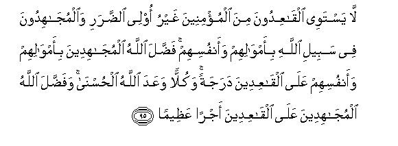 95. La yastawee alqaAAidoona mina almu/mineena ghayru olee alddarari waalmujahidoona fee sabeeli Allahi bi-amwalihim waanfusihim faddala Allahu almujahideena bi-amwalihim waanfusihim AAala alqaAAideena darajatan wakullan waAAada Allahu alhusna wafaddala Allahu almujahideena AAala alqaAAideena ajran AAatheeman