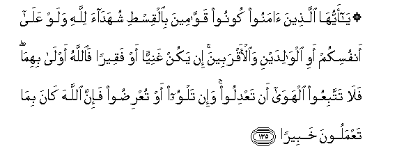 135. Ya ayyuha allatheena amanoo koonoo qawwameena bialqisti shuhadaa lillahi walaw AAala anfusikum awi alwalidayni waal-aqrabeena in yakun ghaniyyan aw faqeeran faAllahu awla bihima fala tattabiAAoo alhawa an taAAdiloo wa-in talwoo aw tuAAridoo fa-inna Allaha kana bima taAAmaloona khabeeran