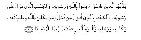 136. Ya ayyuha allatheena amanoo aminoo biAllahi warasoolihi waalkitabi allathee nazzala AAala rasoolihi waalkitabi allathee anzala min qablu waman yakfur biAllahi wamala-ikatihi wakutubihi warusulihi waalyawmi al-akhiri faqad dalla dalalan baAAeedan