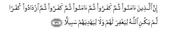 137. Inna allatheena amanoo thumma kafaroo thumma amanoo thumma kafaroo thumma izdadoo kufran lam yakuni Allahu liyaghfira lahum wala liyahdiyahum sabeelan