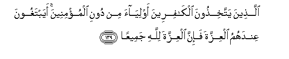 139. Allatheena yattakhithoona alkafireena awliyaa min dooni almu/mineena ayabtaghoona AAindahumu alAAizzata fa-inna alAAizzata lillahi jameeAAan