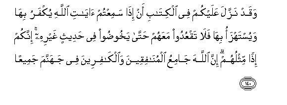 140. Waqad nazzala AAalaykum fee alkitabi an itha samiAAtum ayati Allahi yukfaru biha wayustahzao biha fala taqAAudoo maAAahum hatta yakhoodoo fee hadeethin ghayrihi innakum ithan mithluhum inna Allaha jamiAAu almunafiqeena waalkafireena fee jahannama jameeAAan