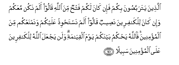 141. Allatheena yatarabbasoona bikum fa-in kana lakum fathun mina Allahi qaloo alam nakun maAAakum wa-in kana lilkafireena naseebun qaloo alam nastahwith AAalaykum wanamnaAAkum mina almu/mineena faAllahu yahkumu baynakum yawma alqiyamati walan yajAAala Allahu lilkafireena AAala almu/mineena sabeelan