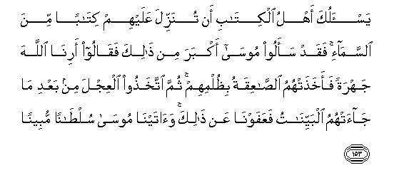 153. Yas-aluka ahlu alkitabi an tunazzila AAalayhim kitaban mina alssama-i faqad saaloo moosa akbara min thalika faqaloo arina Allaha jahratan faakhathat-humu alssaAAiqatu bithulmihim thumma ittakhathoo alAAijla min baAAdi ma jaat-humu albayyinatu faAAafawna AAan thalika waatayna moosa sultanan mubeenan
