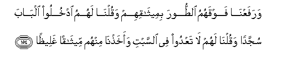 154. WarafaAAna fawqahumu alttoora bimeethaqihim waqulna lahumu odkhuloo albaba sujjadan waqulna lahum la taAAdoo fee alssabti waakhathna minhum meethaqan ghaleethan
