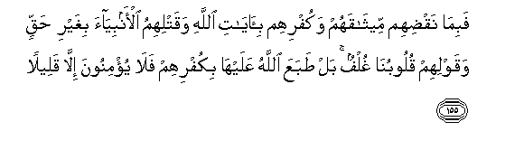 155. Fabima naqdihim meethaqahum wakufrihim bi-ayati Allahi waqatlihimu al-anbiyaa bighayri haqqin waqawlihim quloobuna ghulfun bal tabaAAa Allahu AAalayha bikufrihim fala yu/minoona illa qaleelan