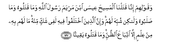 157. Waqawlihim inna qatalna almaseeha AAeesa ibna maryama rasoola Allahi wama qataloohu wama salaboohu walakin shubbiha lahum wa-inna allatheena ikhtalafoo feehi lafee shakkin minhu ma lahum bihi min AAilmin illa ittibaAAa alththanni wama qataloohu yaqeenan
