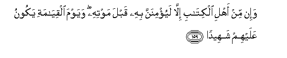 159. Wa-in min ahli alkitabi illa layu/minanna bihi qabla mawtihi wayawma alqiyamati yakoonu AAalayhim shaheedan