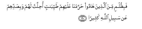 160. Fabithulmin mina allatheena hadoo harramna AAalayhim tayyibatin ohillat lahum wabisaddihim AAan sabeeli Allahi katheeran