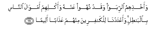 161. Waakhthihimu alrriba waqad nuhoo AAanhu waaklihim amwala alnnasi bialbatili waaAAtadna lilkafireena minhum AAathaban aleeman