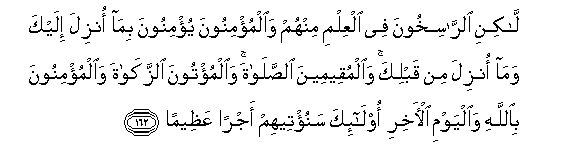 162. Lakini alrrasikhoona fee alAAilmi minhum waalmu/minoona yu/minoona bima onzila ilayka wama onzila min qablika waalmuqeemeena alssalata waalmu/toona alzzakata waalmu/minoona biAllahi waalyawmi al-akhiri ola-ika sanu/teehim ajran AAatheeman