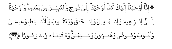 163. Inna awhayna ilayka kama awhayna ila noohin waalnnabiyyeena min baAAdihi waawhayna ila ibraheema wa-ismaAAeela wa-ishaqa wayaAAqooba waal-asbati waAAeesa waayyooba wayoonusa waharoona wasulaymana waatayna dawooda zabooran
