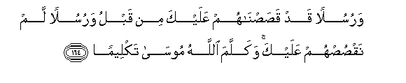 164. Warusulan qad qasasnahum AAalayka min qablu warusulan lam naqsushum AAalayka wakallama Allahu moosa takleeman