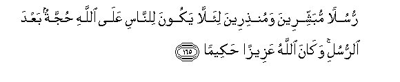 165. Rusulan mubashshireena wamunthireena li-alla yakoona lilnnasi AAala Allahi hujjatun baAAda alrrusuli wakana Allahu AAazeezan hakeeman