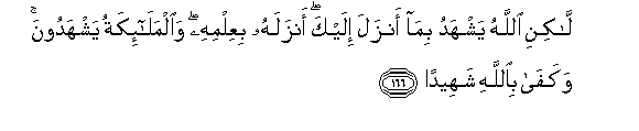 166. Lakini Allahu yashhadu bima anzala ilayka anzalahu biAAilmihi waalmala-ikatu yashhadoona wakafa biAllahi shaheedan