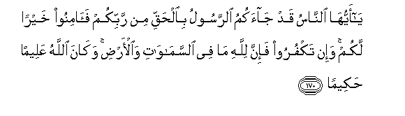 170. Ya ayyuha alnnasu qad jaakumu alrrasoolu bialhaqqi min rabbikum faaminoo khayran lakum wa-in takfuroo fa-inna lillahi ma fee alssamawati waal-ardi wakana Allahu AAaleeman hakeeman
