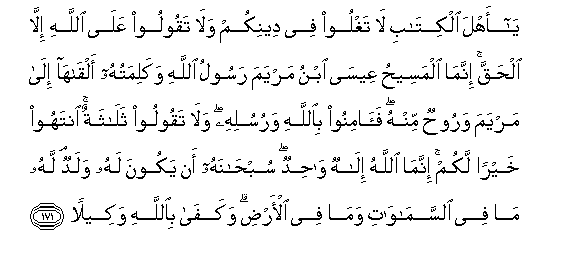 171. Ya ahla alkitabi la taghloo fee deenikum wala taqooloo AAala Allahi illa alhaqqa innama almaseehu AAeesa ibnu maryama rasoolu Allahi wakalimatuhu alqaha ila maryama waroohun minhu faaminoo biAllahi warusulihi wala taqooloo thalathatun intahoo khayran lakum innama Allahu ilahun wahidun subhanahu an yakoona lahu waladun lahu ma fee alssamawati wama fee al-ardi wakafa biAllahi wakeelan