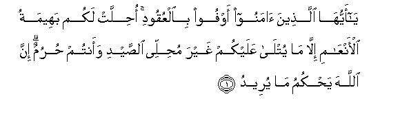 1. Ya ayyuha allatheena amanoo awfoo bialAAuqoodi ohillat lakum baheematu al-anAAami illa ma yutla AAalaykum ghayra muhillee alssaydi waantum hurumun inna Allaha yahkumu ma yureedu