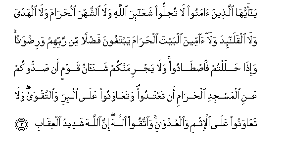 2. Ya ayyuha allatheena amanoo la tuhilloo shaAAa-ira Allahi wala alshshahra alharama wala alhadya wala alqala-ida wala ammeena albayta alharama yabtaghoona fadlan min rabbihim waridwanan wa-itha halaltum faistadoo wala yajrimannakum shanaanu qawmin an saddookum AAani almasjidi alharami an taAAtadoo wataAAawanoo AAala albirri waalttaqwa wala taAAawanoo AAala al-ithmi waalAAudwani waittaqoo Allaha inna Allaha shadeedu alAAiqabi