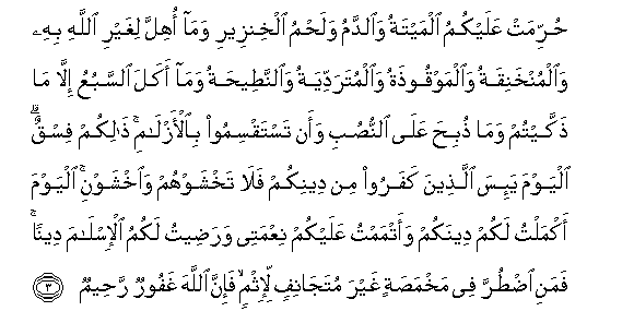 3. Hurrimat AAalaykumu almaytatu waalddamu walahmu alkhinzeeri wama ohilla lighayri Allahi bihi waalmunkhaniqatu waalmawqoothatu waalmutaraddiyatu waalnnateehatu wama akala alssabuAAu illa ma thakkaytum wama thubiha AAala alnnusubi waan tastaqsimoo bial-azlami thalikum fisqun alyawma ya-isa allatheena kafaroo min deenikum fala takhshawhum waikhshawni alyawma akmaltu lakum deenakum waatmamtu AAalaykum niAAmatee waradeetu lakumu al-islama deenan famani idturra fee makhmasatin ghayra mutajanifin li-ithmin fa-inna Allaha ghafoorun raheemun